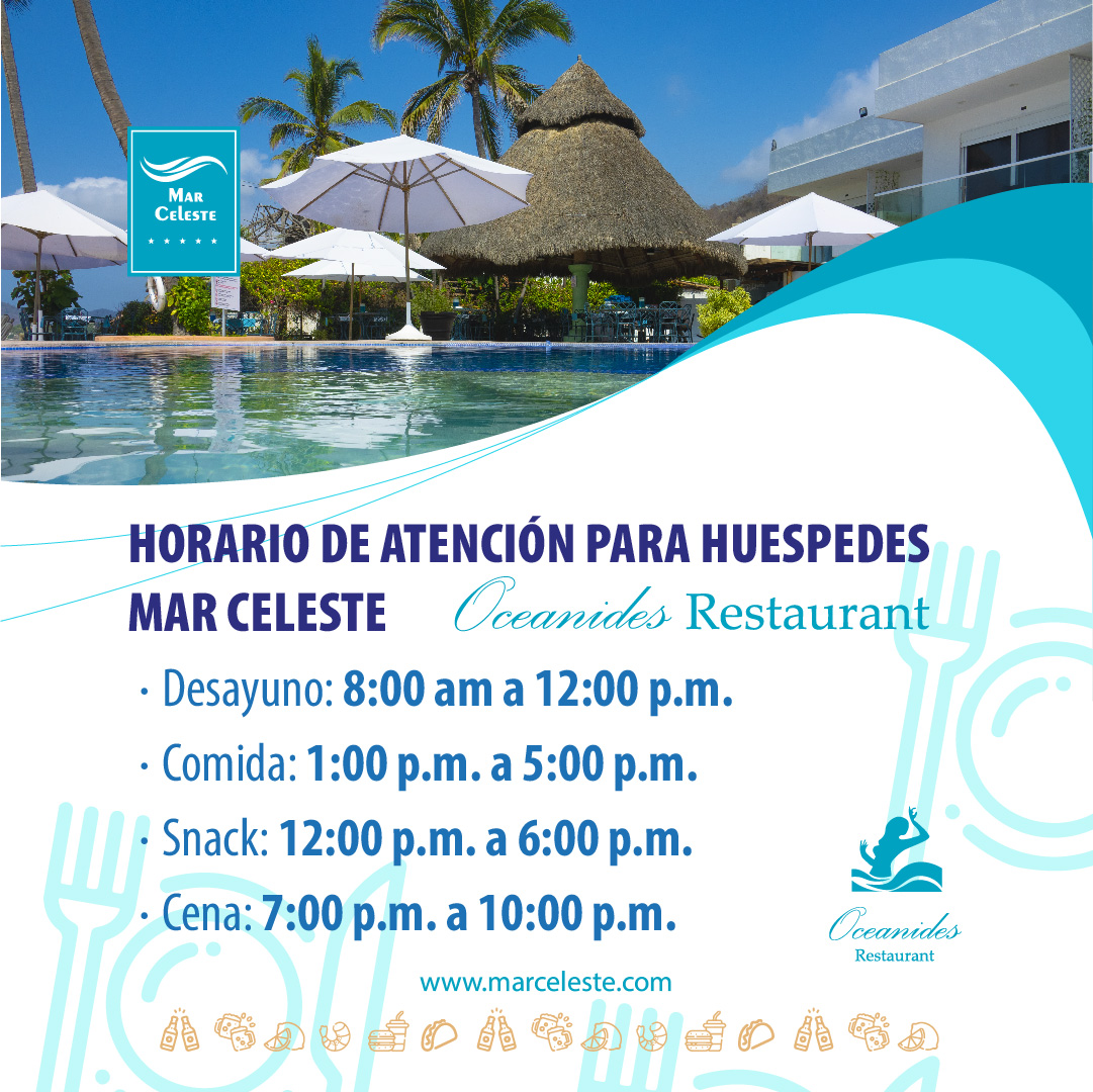 Restaurant Oceanides le invita a que comience su festín de alimentos con un ceviche estilo Colima representativo de la región, o la especialidad de la casa: ceviche Mar Celeste; también le recomendamos el aguachile de camarón o un chicharrón de atún, el Festival de Ceviches Mar Celeste, elaborado con nuestros tres tipos de ceviches, o la fuente de mariscos (3 estilos de ceviche, pulpo a la mexicana y camarones).